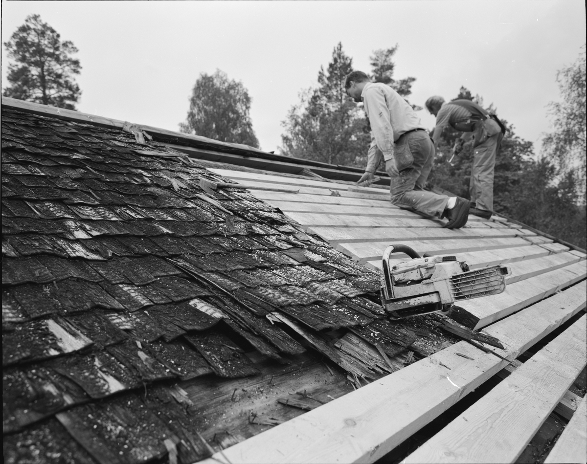 Ösjöfors, bruksbyggnaden. Omläggning av spåntak. Lägger ny takpanel, samt river gammalt tak med motorsåg på byggnadens norra sida.