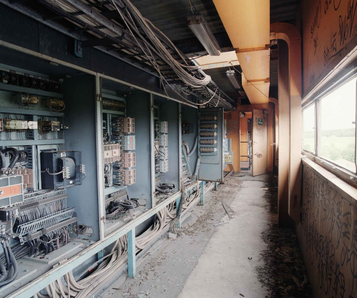 Bildtext: Lövsta sopförbränningsanläggning 2004. Korridor högst upp i anläggningen som förbinder de två manöverhytterna för kranförare. I och med moderniseringsarbetet av sopförbränningsanläggningen 1962-72 installerades två fasta manöverhytter för kranförarna som skötte de två skoporna i bunkern.