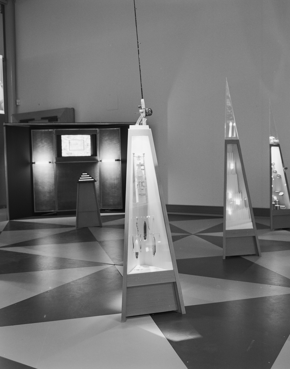 Dokumentation av utställningen "Kulor, Krus och Kaviar", Wallenberghallen. Produkttorn med " Ambasadörrullen", spinnspörulle.