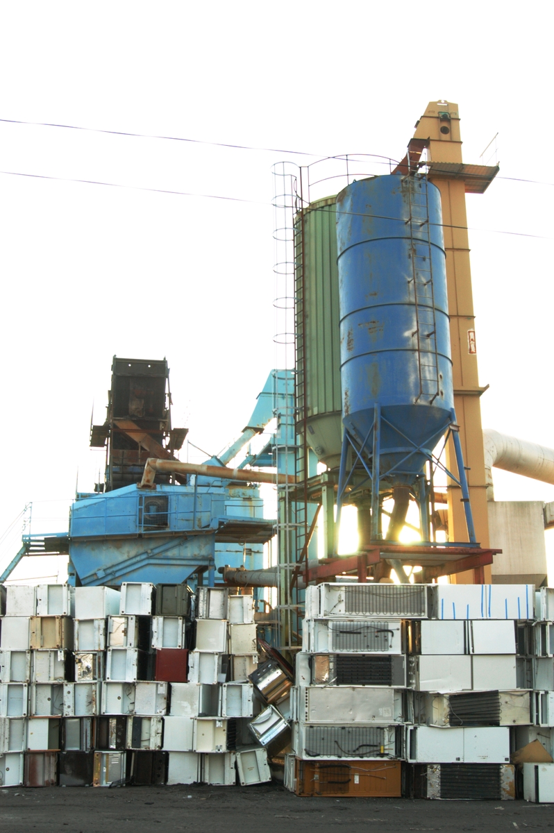 Bildtext: Kylskåpen ligger i travar i väntan på återvinning.