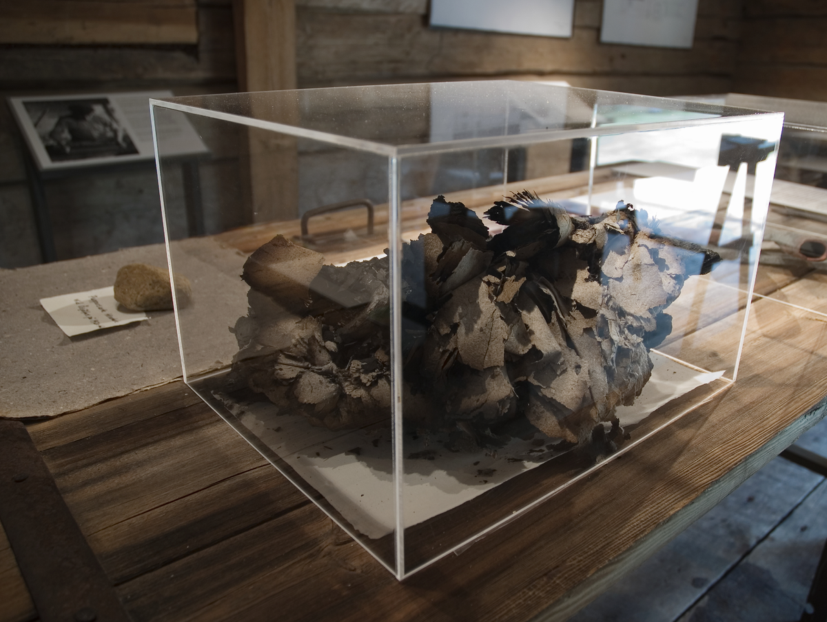 Interiör från pappersmagasinet med utställning om branden och demonstration av papperstillverkning