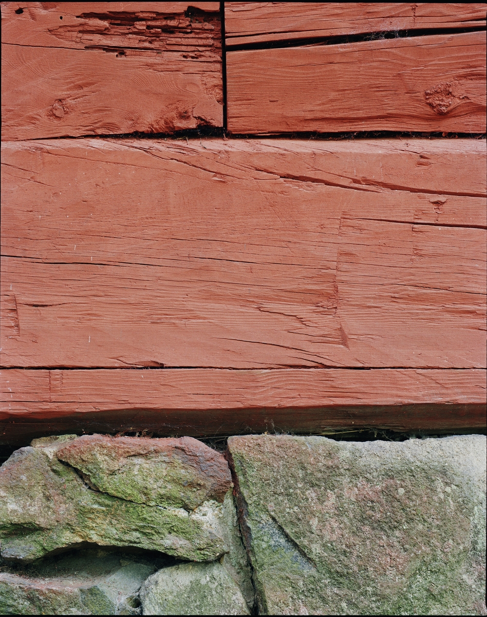 Falu rödfärg av timmervägg med stengrund på Skansen.