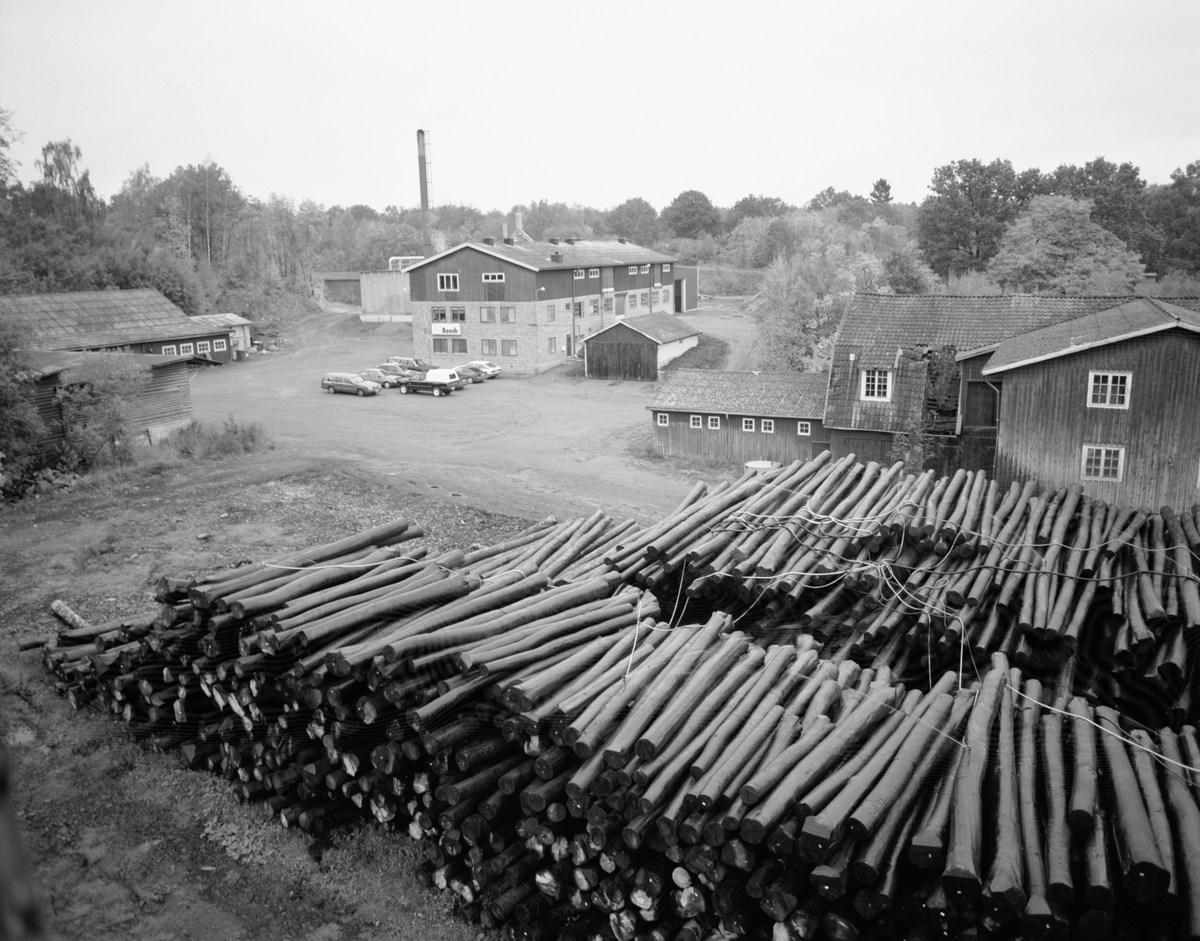 Vy över fabriksområdet med bokstockslagret i fronten. T h. den ursprungliga produktionsbyggnaden, numera emeballageförråd. I mitten produktionsbyggnaden och kontor. T v. en del av verkstaden. I bakgrunden syns skorstenen på flissilon.