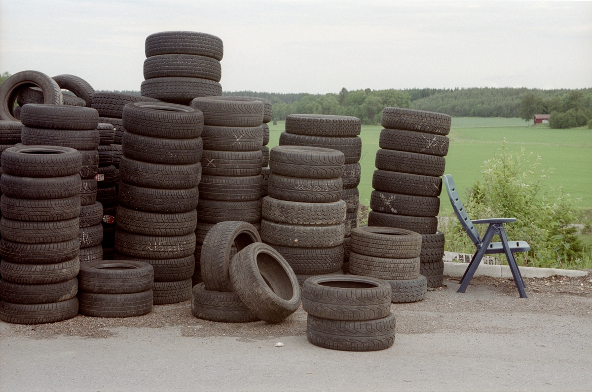 Tekniska museets miljögrupp på studiebesök på Rangsells anläggning i Högbytorp utanför Bro. Här är depon för däck. En grupp Afrikaner jobbar på entreprenad där. De sorterar ut de bra däcken, oftast vinterdäck, och skickar dom till länder i afrika i konteinrar.