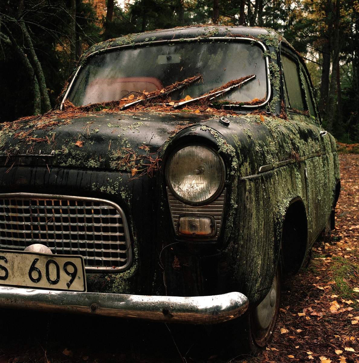 Detalj på en gammal frånställd Ford i skogen på Vindö.