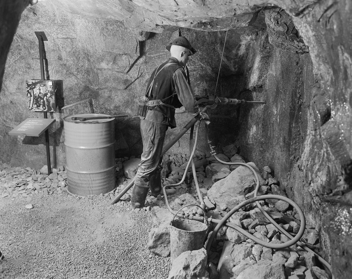 Dokumentation av Gruvutställningen. Femte rummet: Gruvmiljö 1940-talet. Vid Atlas Diesel borrmaskin RH-656 en docka.