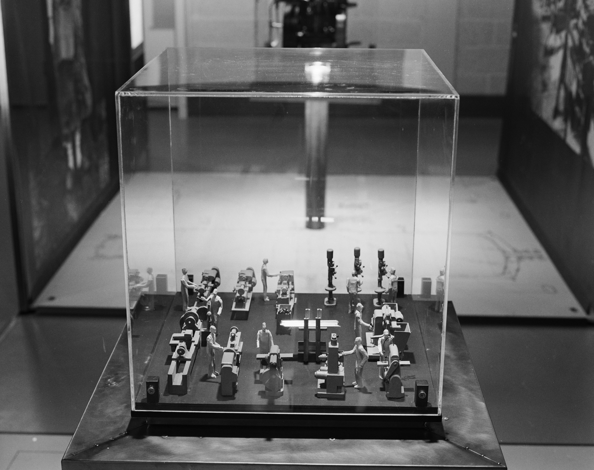 Epok 2. Dokumentation av utställningen "Kulor, Krus och Kaviar", Wallenberghallen. Tidsmaskinen, skildras med små modeller från direktdriftens tid. Tillverkad på 50-talet.