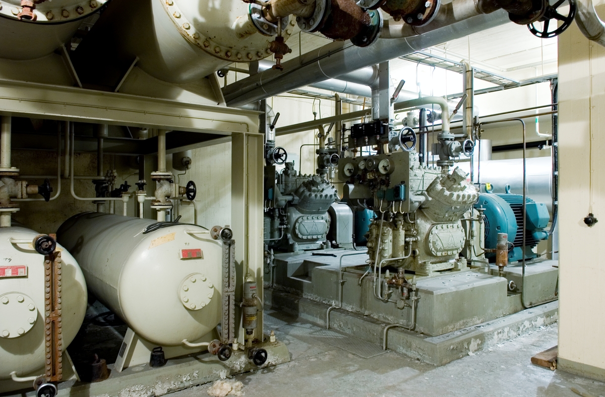 Bilden föreställer: Plan 2 nödkylningsrum 202. Två stycken kompressorer för reaktorns nödkylning och amoniak tankar. Förklaring av system framgår av rapport :Statens Vattenfallsverk A23/60 5/4 1960.