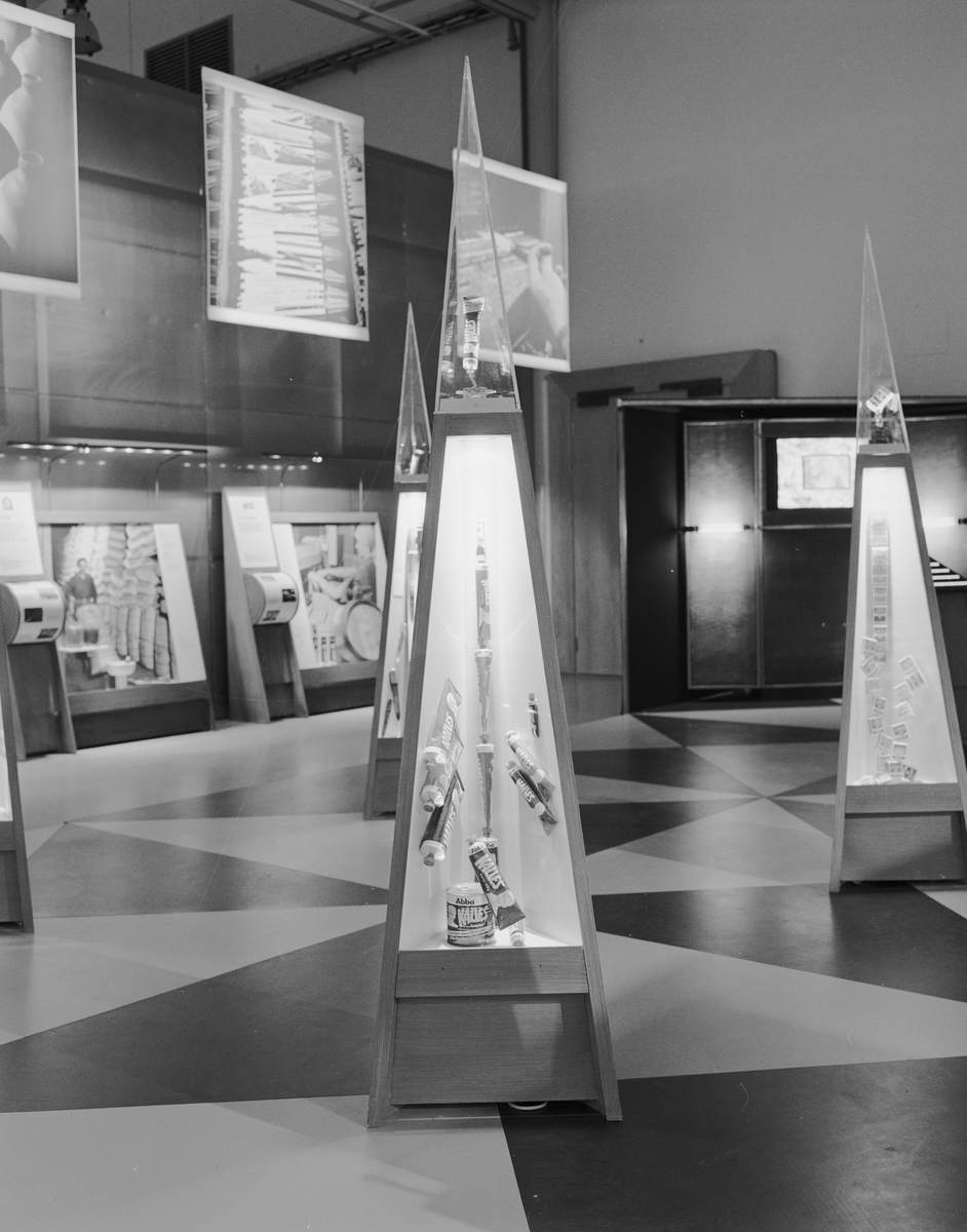 Dokumentation av utställningen "Kulor, Krus och Kaviar", Wallenberghallen. Produkttorn med "Kalles kaviar".