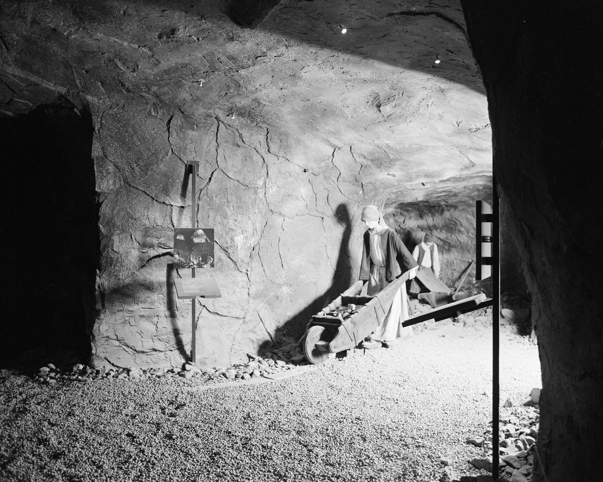 Dokumentation av Gruvan. Första rummet: "Tillmakning (metod att spränga i gruvor) och lastning". Kvinnlig docka och kärra.