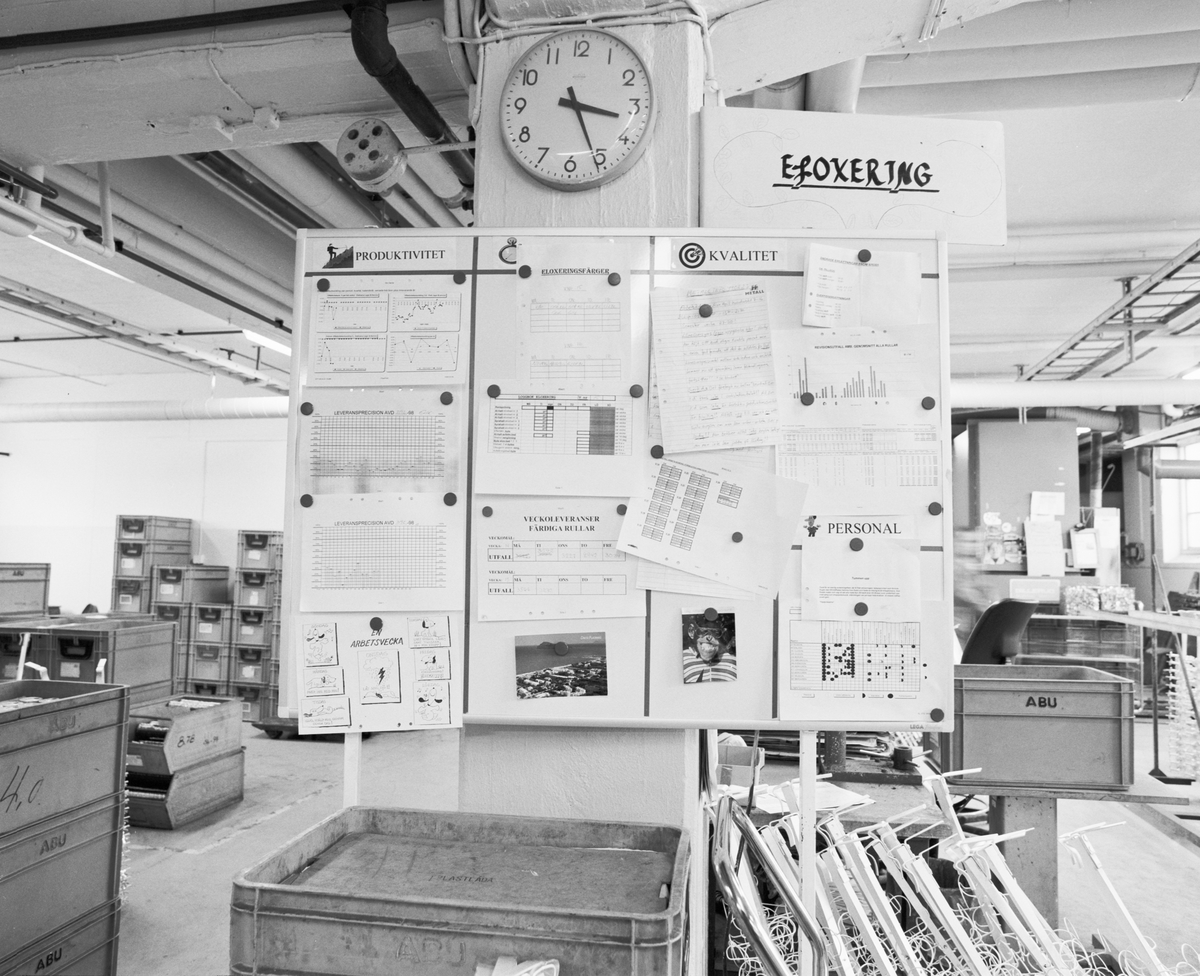 Informationstavla på ytbehandlingsavdelningen. Redovisar regelbundet resultat på kvalitet, leveransprecision, produktionsplaner, personfrågor m m.