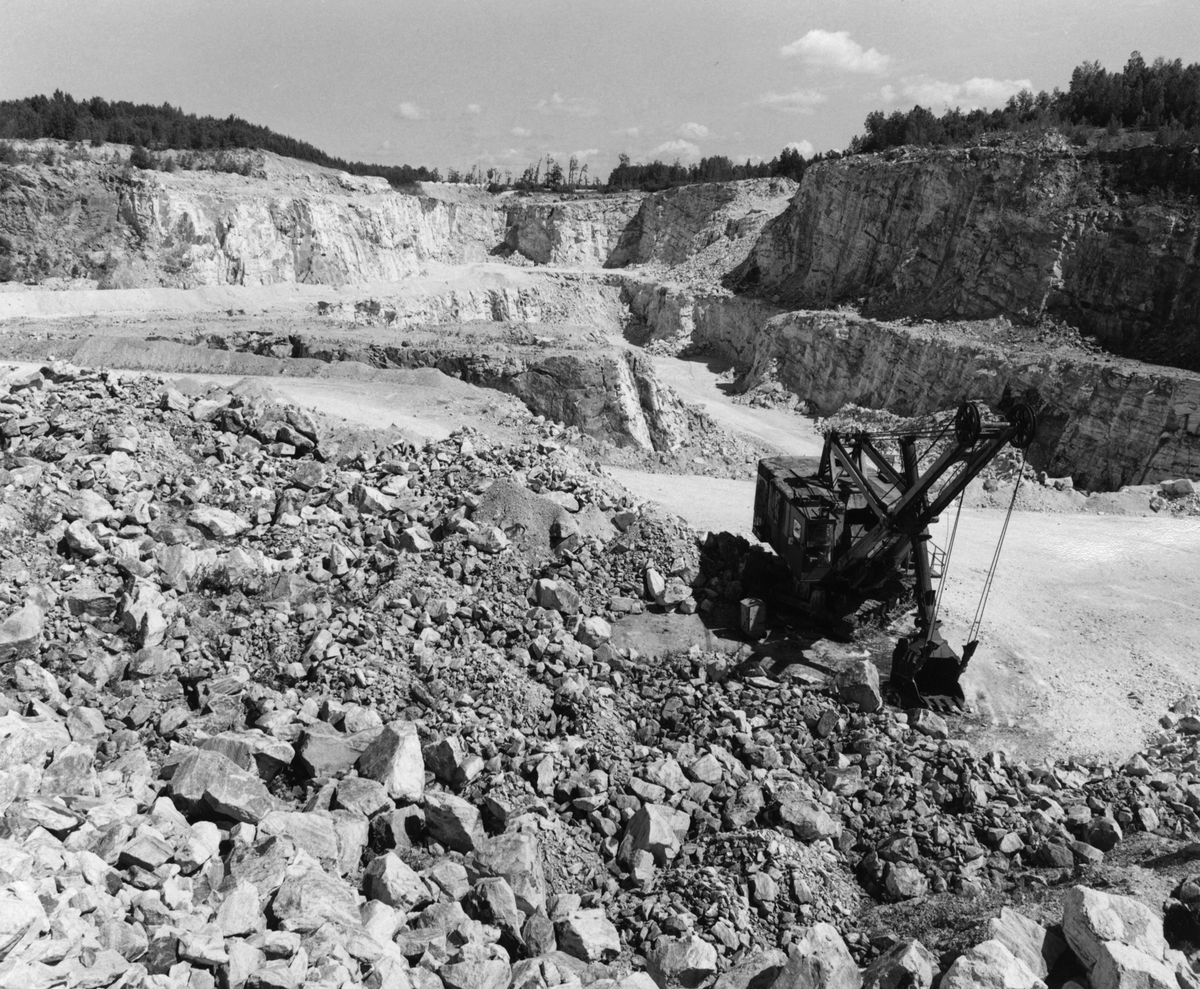 Kalklinbanan Forsby - Köping. Eldriven grävmaskin från 1954. Användes vid lastning av sten. Längst bort i bild nuvarande brytfront.