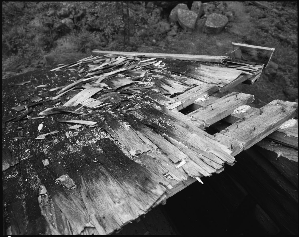 Ösjöfors, bruksbyggnaden. Omläggning av spåntak. Påbörjad rivning av verkstugans (bruksbyggnadens) södra tak.