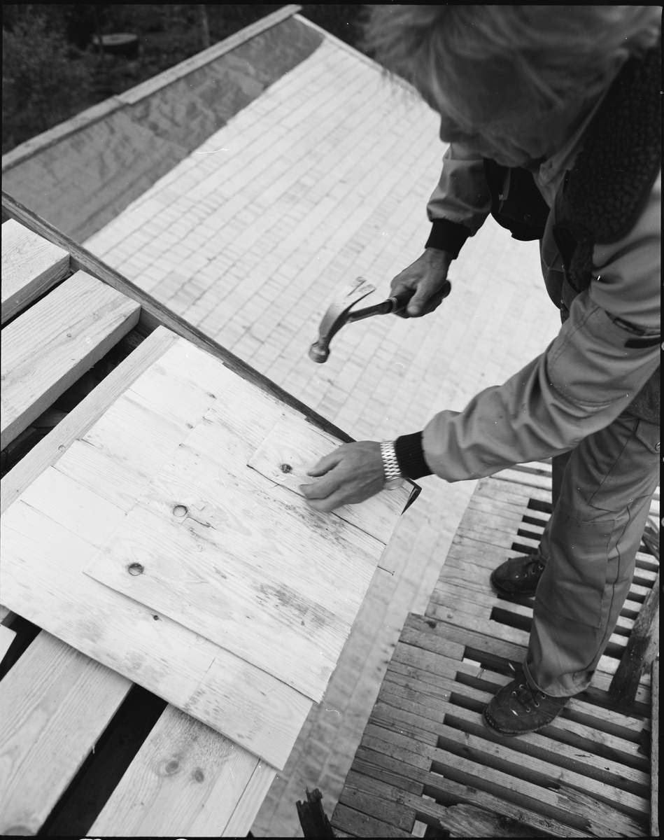 Ösjöfors, bruksbyggnaden. Omläggning av spåntak. Påbörjad läggning av stickor på brukets (bruksbyggnadens) norra sida.