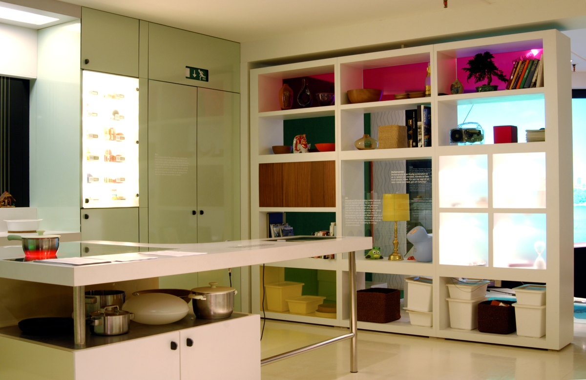 Tänk om. En utställning på Telemuseet om hur det skulle kunna se ut i framtiden i våra hem. I utställningen ingår en film em en familj som skulle kunna tänkas bo i detta hem. Det är ett kök, vardagsrum, sovrum, badrum, uterum och hall. Möbler och teknik som rummen är utrustade med är utvecklat och designat utifrån ett tänkbart framtidssenario. Detta är köket med sitt kylskåp som har hyllor för veckans dagar och bokhylla mellan vardagsrum och kök.
