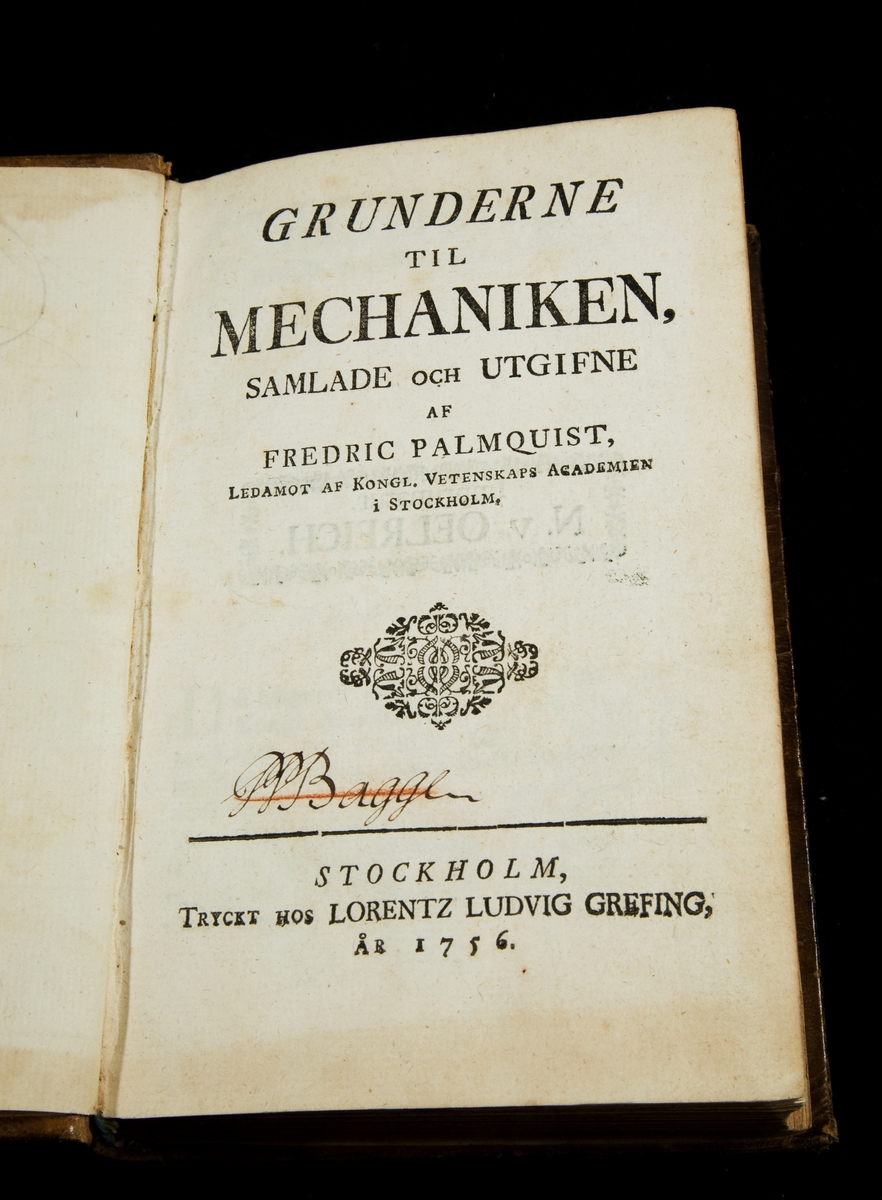 Fredric Palmquist, ledamot av kungliga vetenskaps akademien, "Grunderne til Mechaniken" Stockholm 1756.