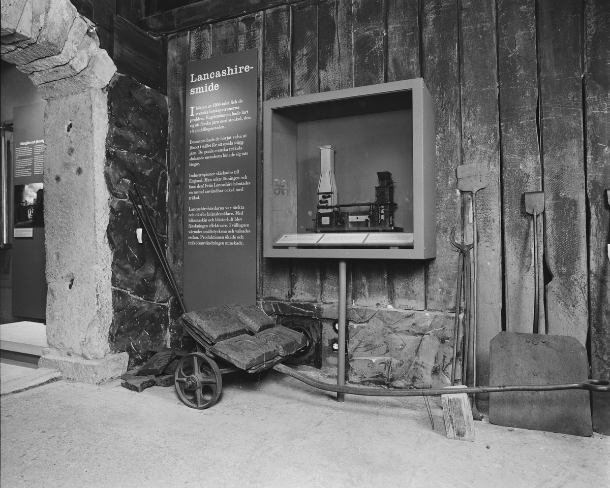 Dokumentation av Ferrum. Ingång till Lanchashiresmedjan, kärra, modell vällugn och redskap.