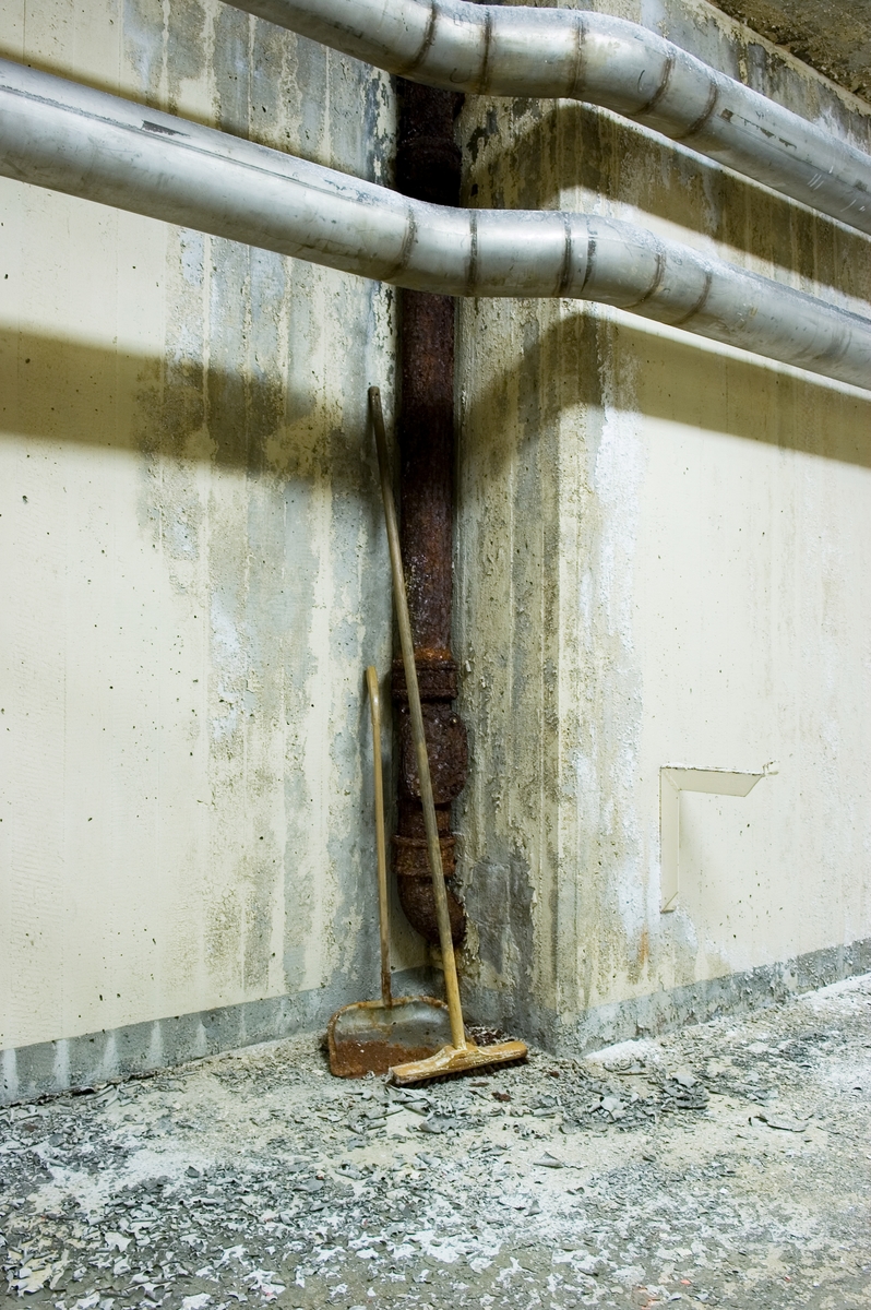 Bilden föreställer: Plan 4 KoS-byggnaden rum 402. Städarna kom inte tillbaka. En stämningsbild hur det kommer att se ut när byggnaden lämnas vind för våg. Åke Bergman öppnade upp, torkade med fläktar och värme mm. Idag mår Ågesta ganska bra men det kräver omskötsel. Förklaring av system framgår av rapport :Statens Vattenfallsverk A23/60 5/4 1960.