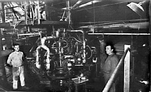 INTERIÖR FRÅN ÅRNÄS GLASBRUK DÄR TRE MÄN STÅR VID EN MASKIN FÖR TILLVERKNING AV FLASKOR