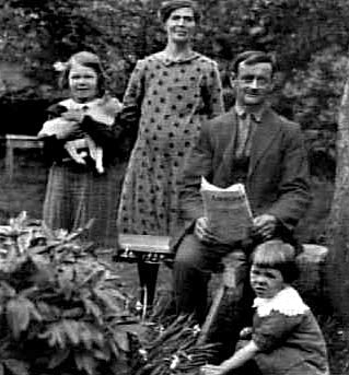 FAR OCH MOR MED SINA TVÅ DÖTTRAR UTE I TRÄDGÅRDEN.