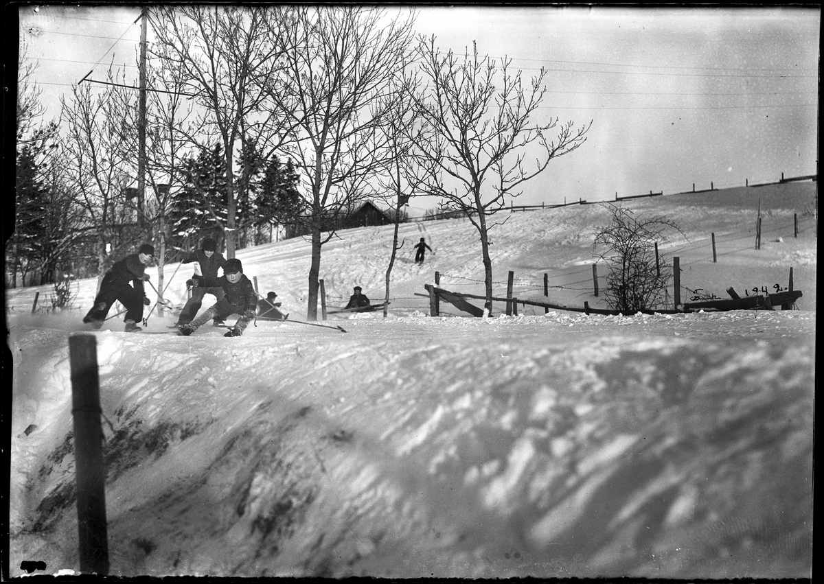 Kälk- och skidåkande barn intill korsvägen i Låstad
