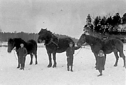 TRE BARN MED TRE HÄSTAR I SNÖN