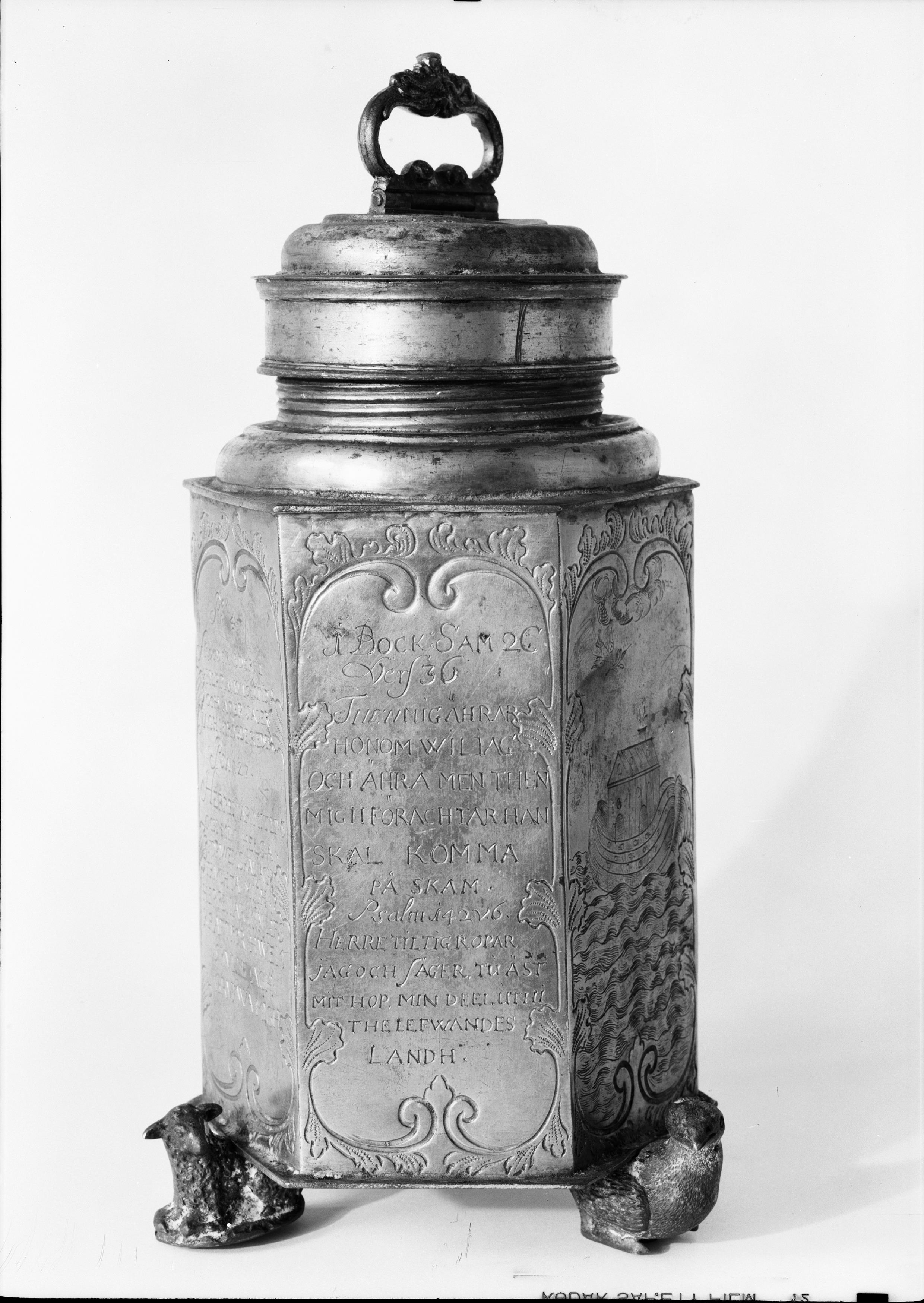 Vinbehållare, vinflaska av förgylld mässing från 1688.