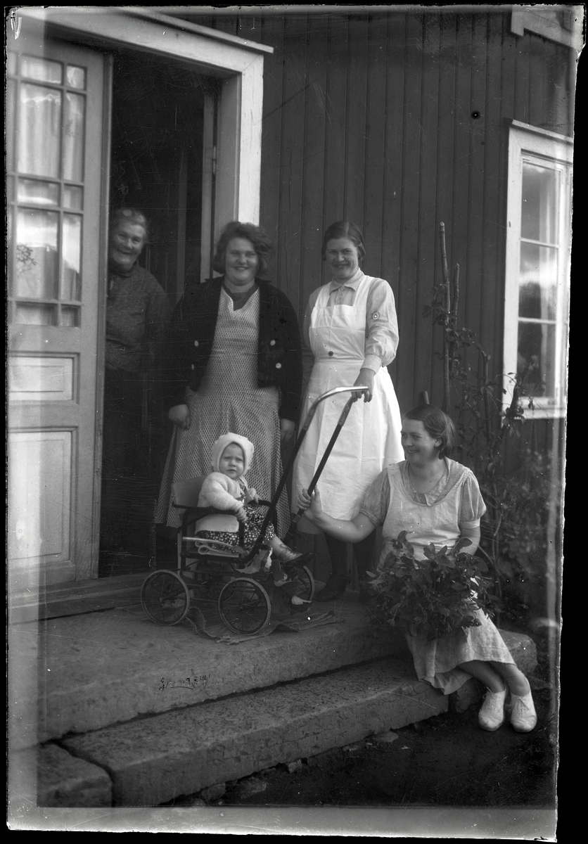 Tre generationer poserar på trappa