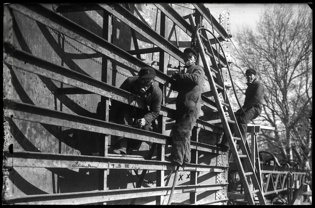 Tre män svetsar på båtskrov
