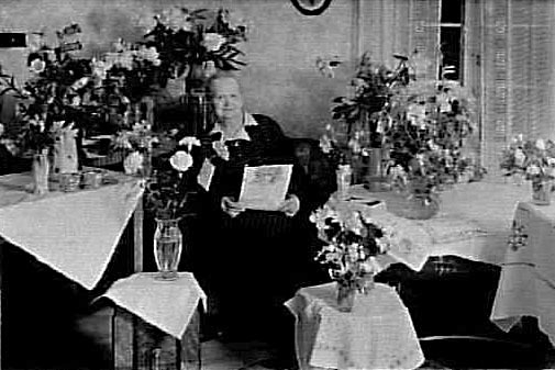 EN ÄLDRE KVINNA SITTANDE BLAND BLOMMOR PÅ SIN HÖGTIDSDAG