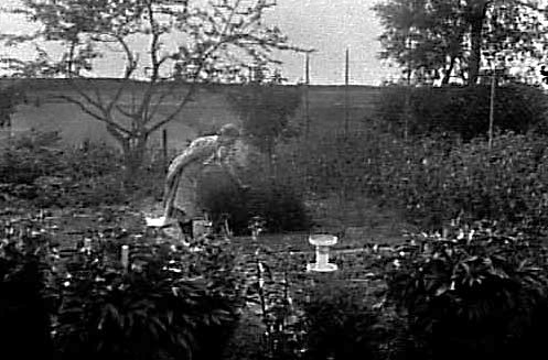 EN KVINNA PLOCKAR BLOMMOR I SIN TRÄDGÅRD. EN REGNMÄTARE STÅR I FÖRGRUNDEN
