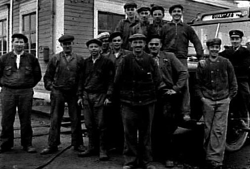 Ett arbetslag stående framför en buss vid järnvägsstationen i Gullspång.