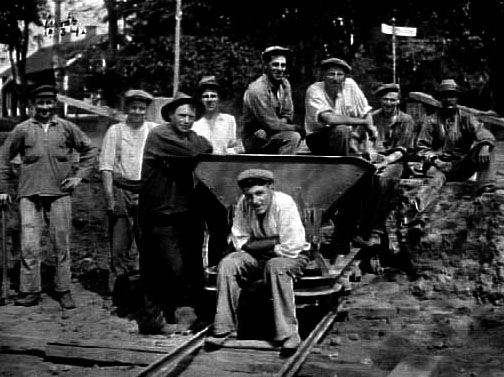 NÅGRA GLASBRUKSARBETARE OMKRING EN SPÅRBUNDEN VAGN