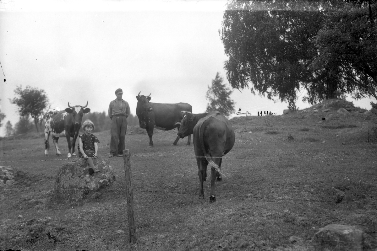 Åke Gustavsson med sin dotter och kreatur i hagen