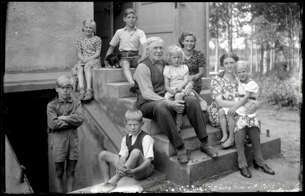 Stor familj framför hus