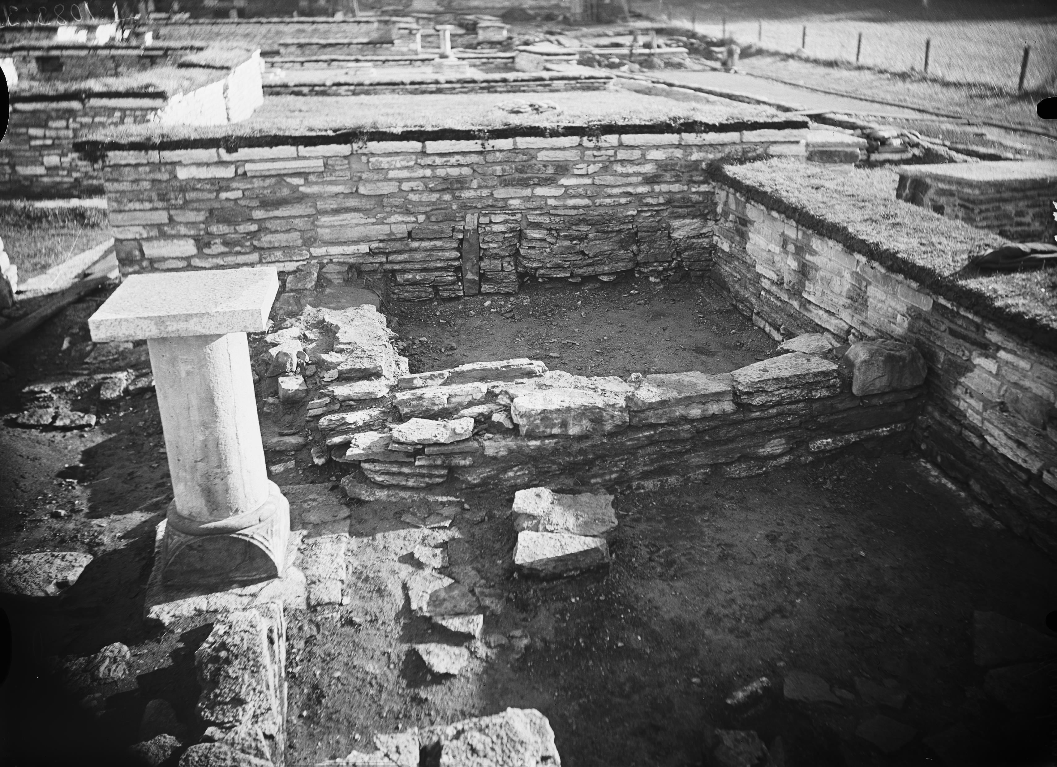 Västra längans långa kolonnrum, sydligaste delen. Eldhärden utgrävd och dess västra mur blottad. Från väster.