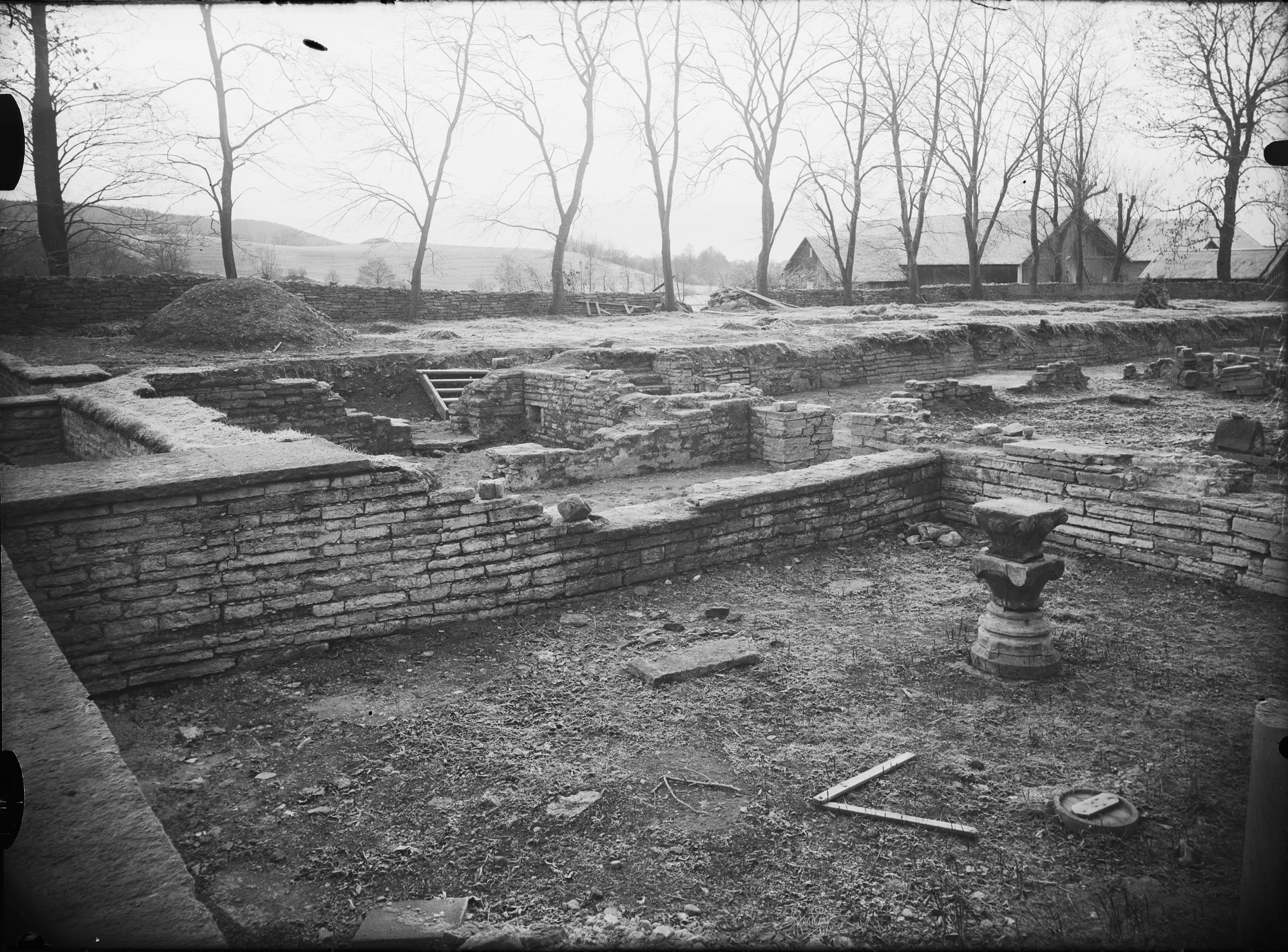 Överblick öven östra längan, delvis konserverad, och närmaste områden vid arbetets avslutande 1922. Brunnen nedtill till höger ny. De två sandstenskapitelen, som funnits inne i kyrkan, där de använts av De la Gardie, höra till kapitelsalen. Från nordöst.