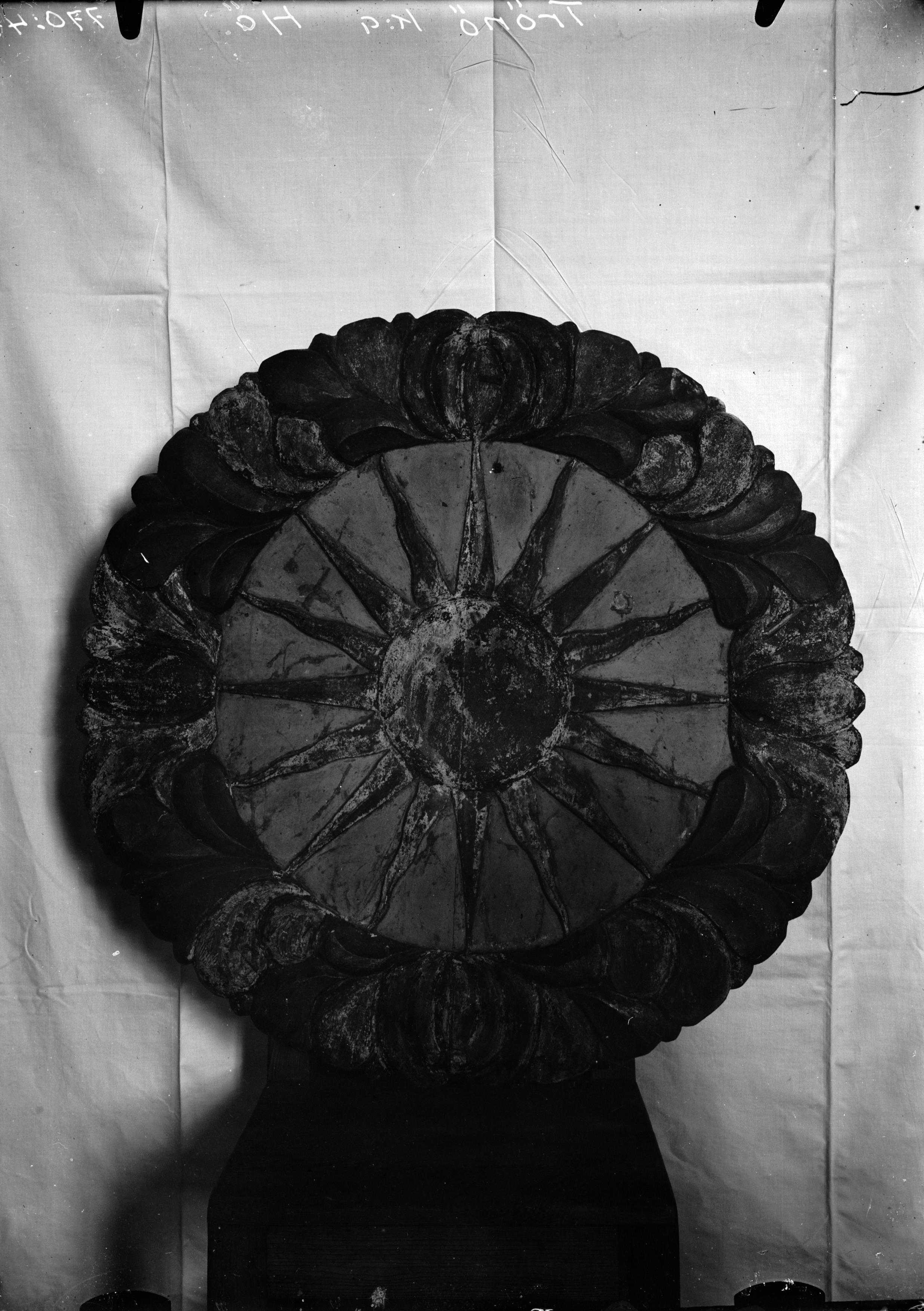 Solhjul av trä. Inom ring av röda och förgyllda blad en sol med ansikte, från vilket strålar utgå, mot blå botten. Snabbinv.