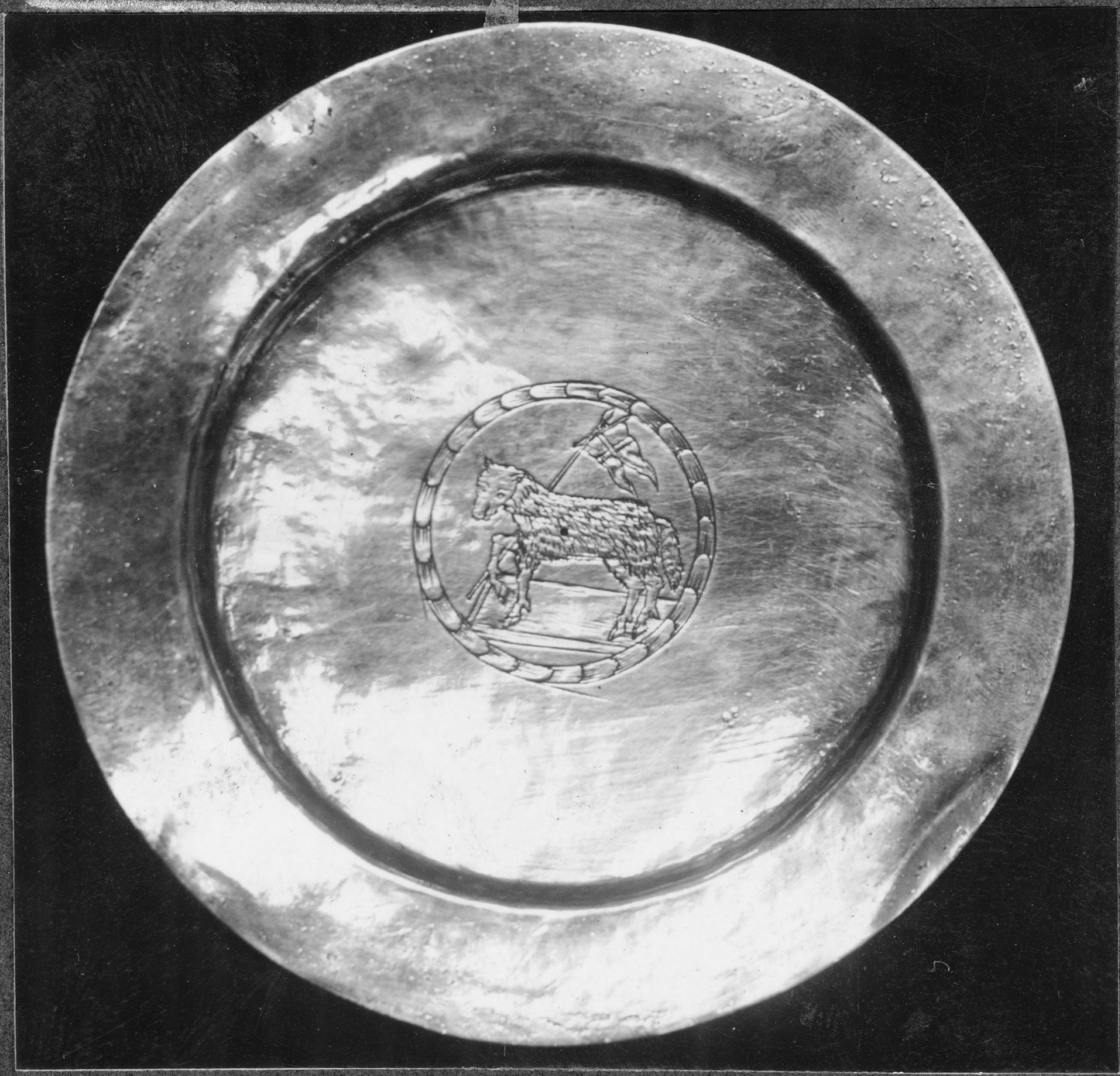 Patén, förgyllt silver, mittgravyr med Agnus Dei inom krans, 1600-talet.