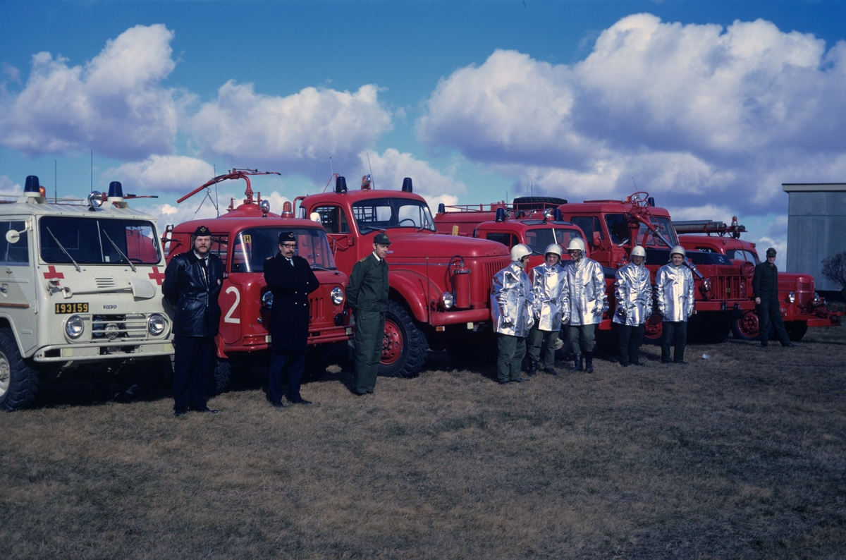 Fordon och personal ur brandkåren på F 3 Östgöta flygflottilj står uppställda på Malmens flygfält, våren 1973.
