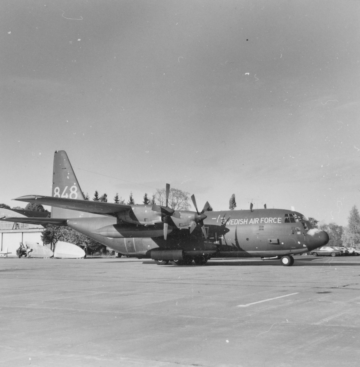 Urlastning av flygplan TP 84 nummer 848 på flygfältet framför en hangar på F 3 Malmen. Flygplanet har ett flygplan Spitfire som last, vilket har anlänt till Flygvapenmuseum från Kanada.