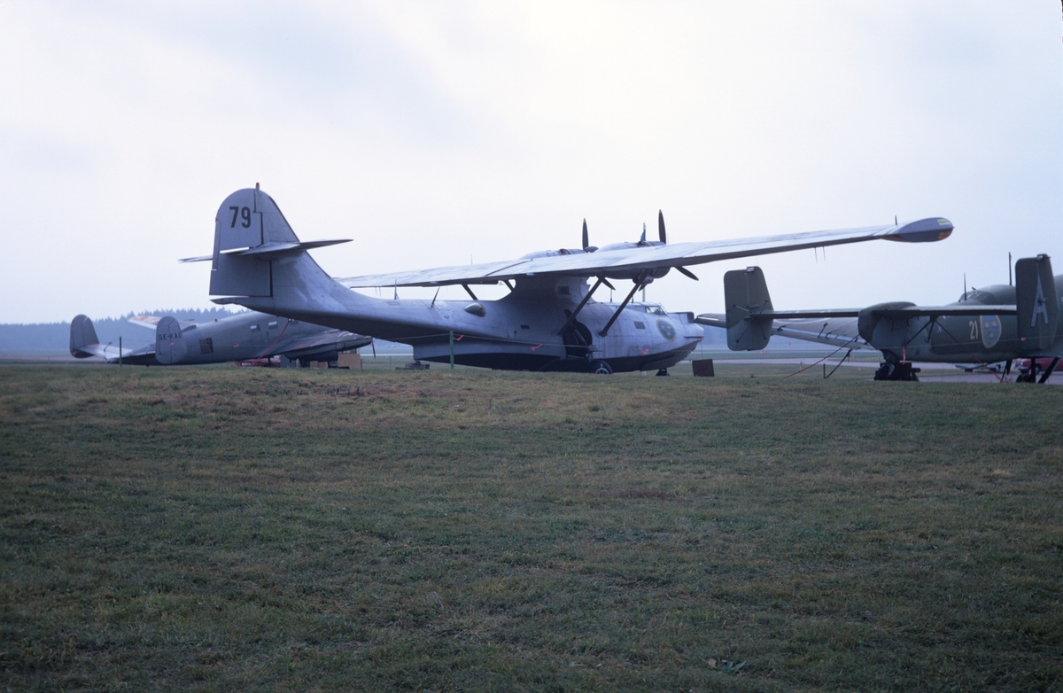 Flygplan TP 47 001 Catalina uppställt vid flygdagen på Malmen, 10 september 1972. Vy snett bakifrån. Museiflygplan från Flygvapnets Malmensamlingar.