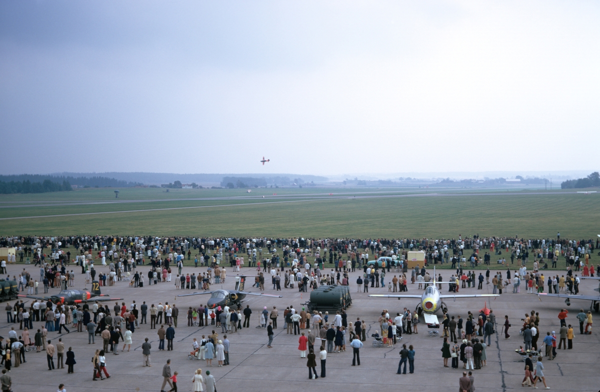 Flygdagen på Malmen den 10 september 1972. Publik och utställning på flygfältet. Ett propellerflygplan under flyguppvisning.