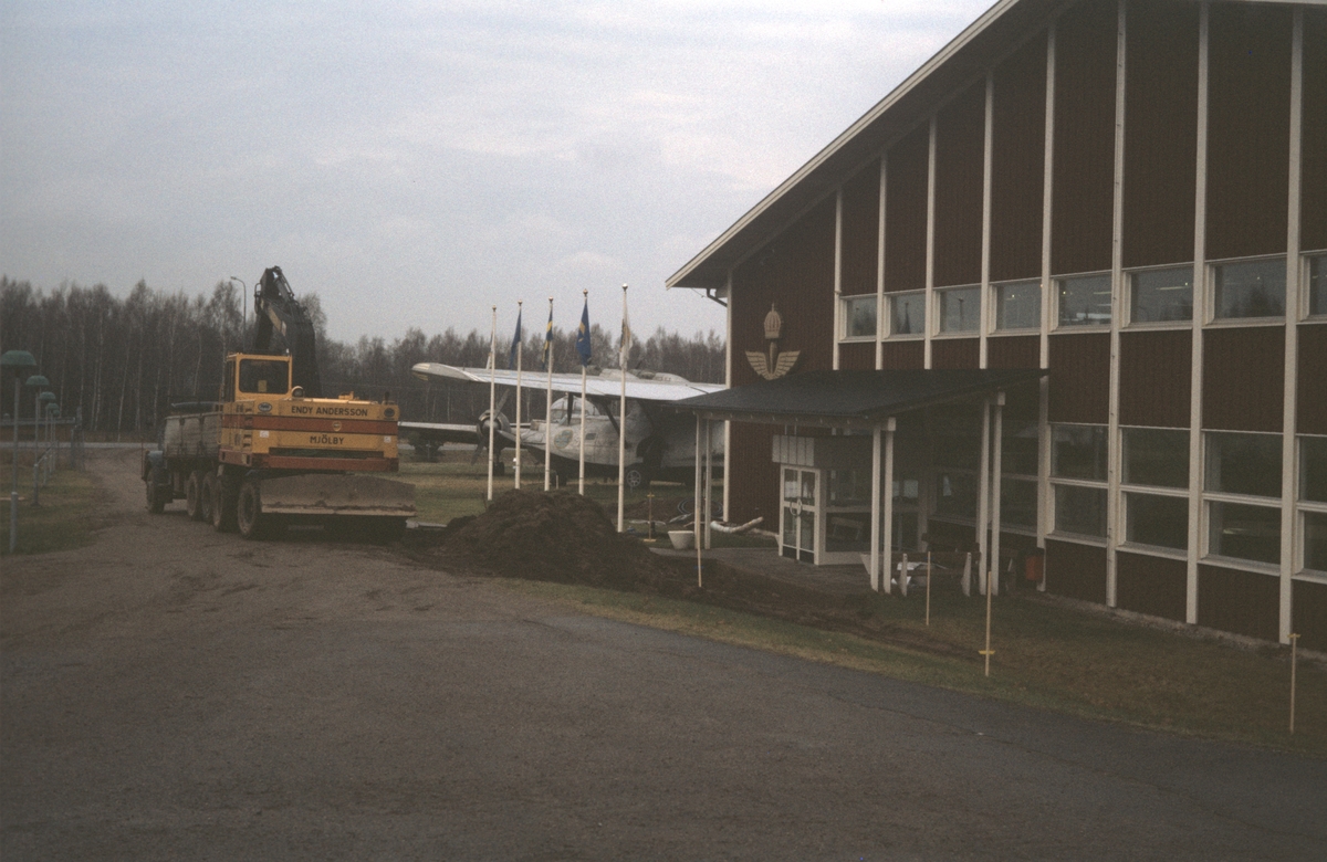 Markarbete vid Flygvapenmuseums entré under utbyggnaden Etapp 2, våren 1988. Exteriör.
