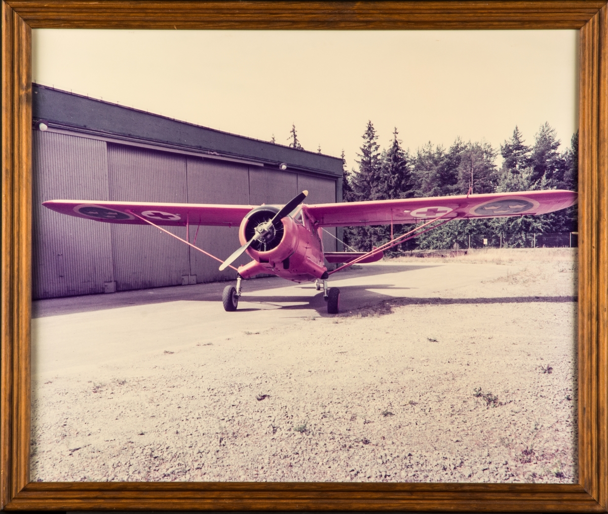 Ambulansflygplan TP 78 nummer 78001 står uppställt framför en hangar på Malmen. Vy framifrån. Inramat foto.