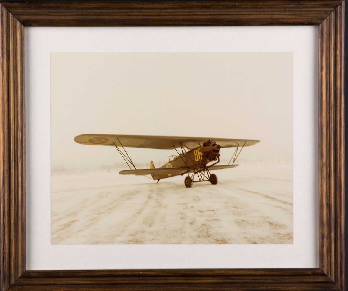 Flygplan S 6B nummer 386 står på ett fält på Malmen, vintertid. Inramat foto.