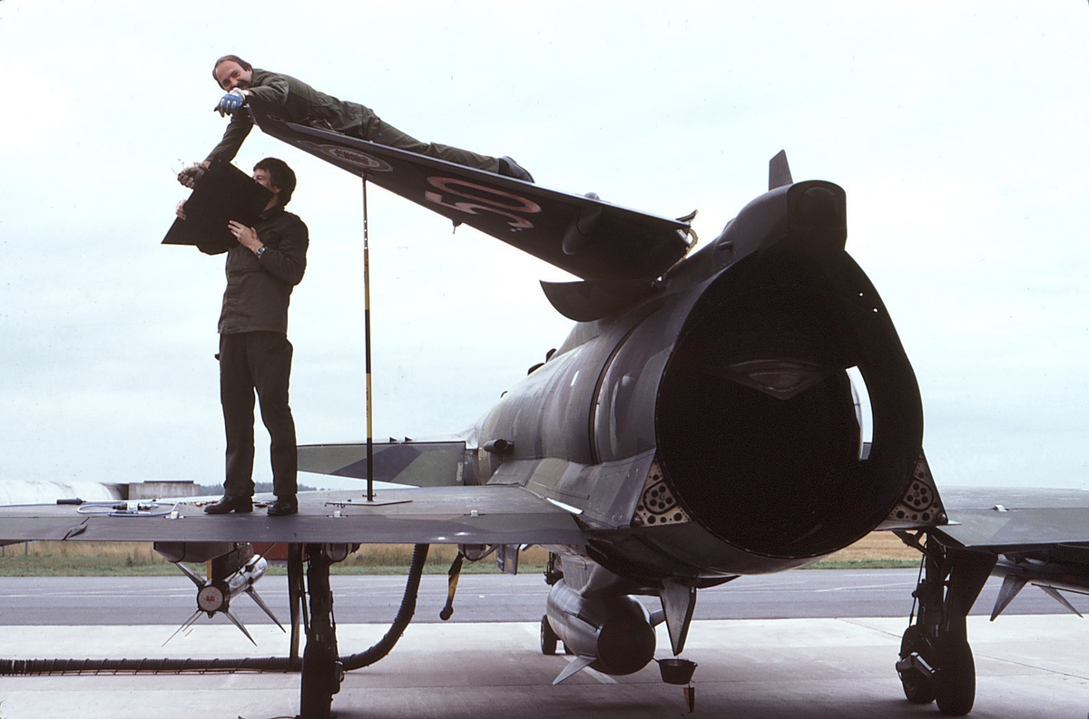 Två män utför antennbyte på flygplan JA 37 Viggen på F 13, Bråvalla.