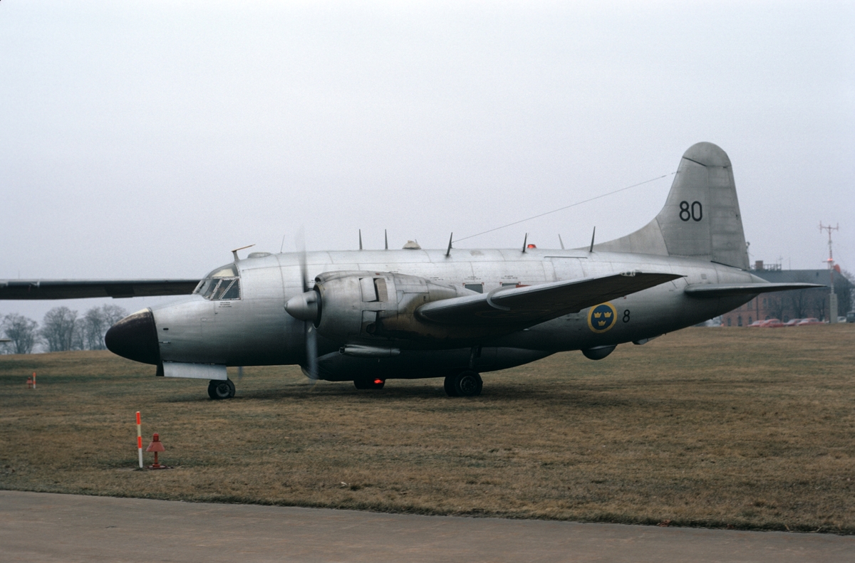 Flygplan TP 82 Vickers Varsity märkt nummer 80 tillhörande F 8 Barkarby står på F 3 Malmens flygfält, våren 1973.