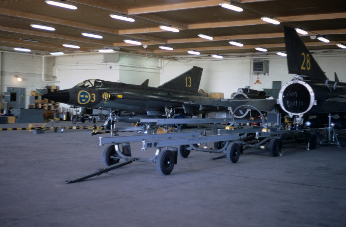Flygplan J 35 nummer 13 och 28 står i en hangar på F 3 Malmen, våren 1973. Underhåll pågår.