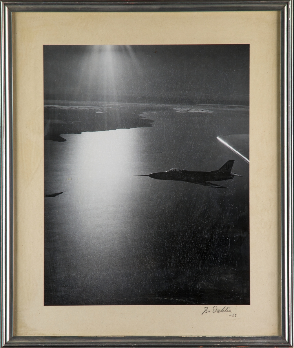 Flygplan Saab 32 Lansen prototyp i luften över skärgård.